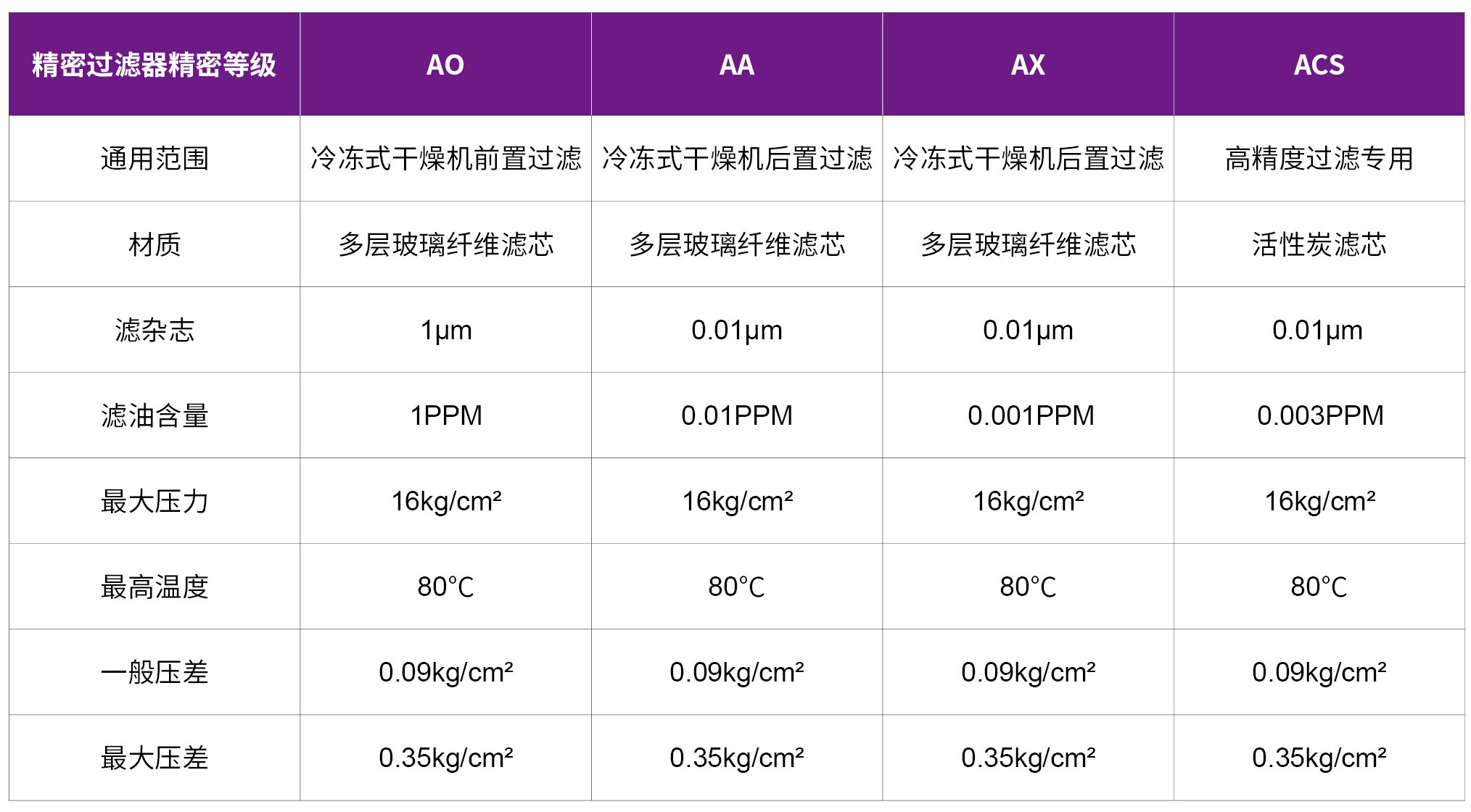 AA:高效除油過濾,通常安裝在AO級過濾器后部,去除大于0.01微米(um)的塵埃粒子以及水霧和油霧,油霧含量不超過:0.01mg/m3 (21℃時)、0.01ppm(w) (70℉時)。